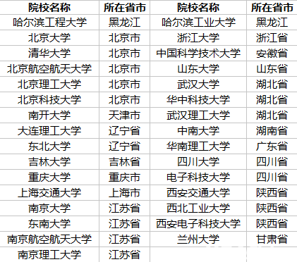“強軍計劃”院校名單: