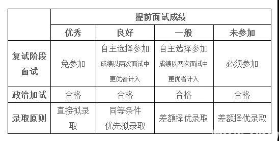 參加提前面試獲得良好者,如聯(lián)考成績達初試分?jǐn)?shù)線(含總分和單科分),可自主選擇是否參加復(fù)試階段面試(最終成績以兩次面試中更優(yōu)的計入);政治加試合格,在同等條件下優(yōu)先進入擬錄取環(huán)節(jié)。