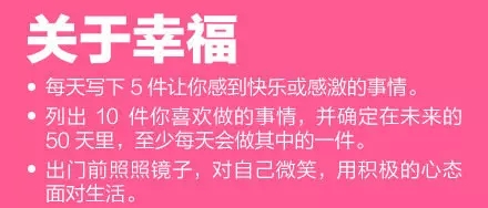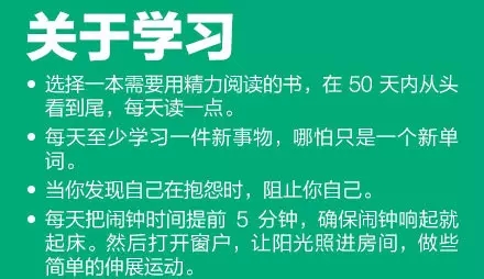 ①堅持閱讀,選本好書,每天讀一點;②每天至少學習一件新事物,哪怕只是一個新單詞;③創建開支計劃,確保開銷在預算內;④確定你經常浪費時間的5件事,縮短花在這些事上的時間;⑤選擇一種持續影響你飲食健康的食物,逐漸戒掉。35個小改變,讓你的生活變得不一樣!