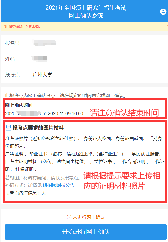 注意:請一定要留意“報考點要求的圖片材料”和“確認結束的時間”,先準備好相應的材料照片,然后點擊“開始網上確認”進行下一步操作,在規定的時間內完成所有確認工作。