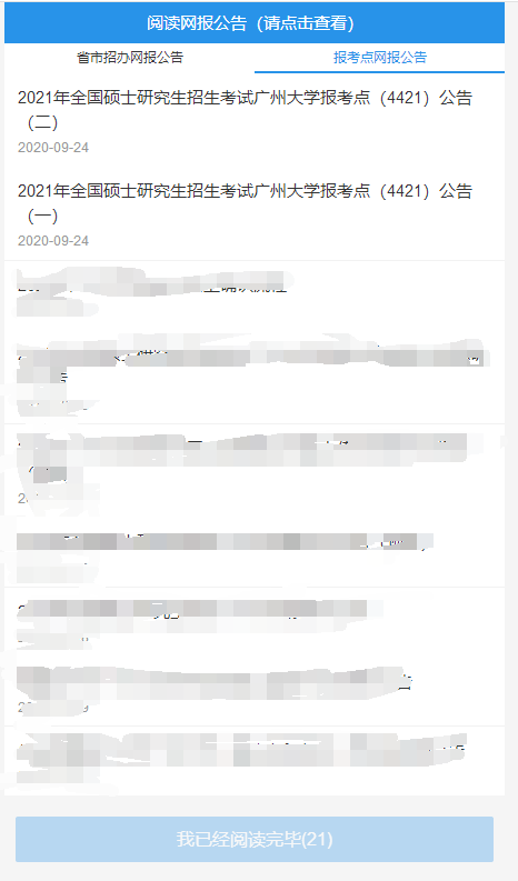 務必仔細閱讀網報公告和考點公告,因未按公告要求,錯選報考點、錯報招生單位的考生、網報信息無效等,不再補報。確認后點擊“我已經閱讀完畢”。