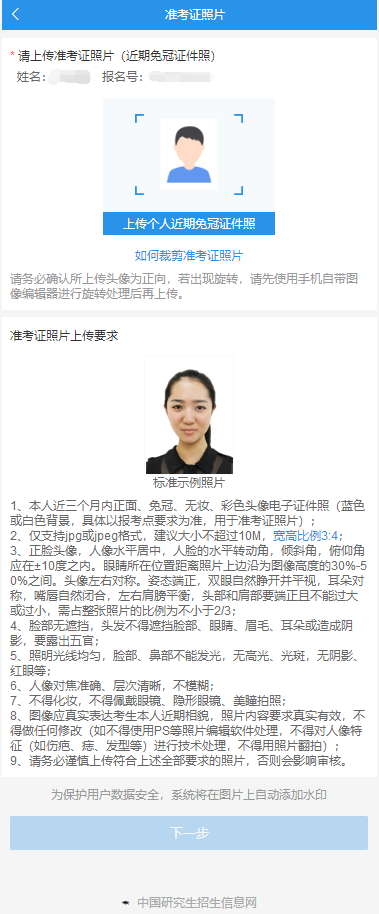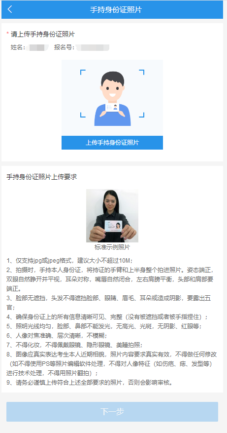 參照示例并嚴格按要求上傳證件照,上傳并檢查無誤后點擊“下一步”
